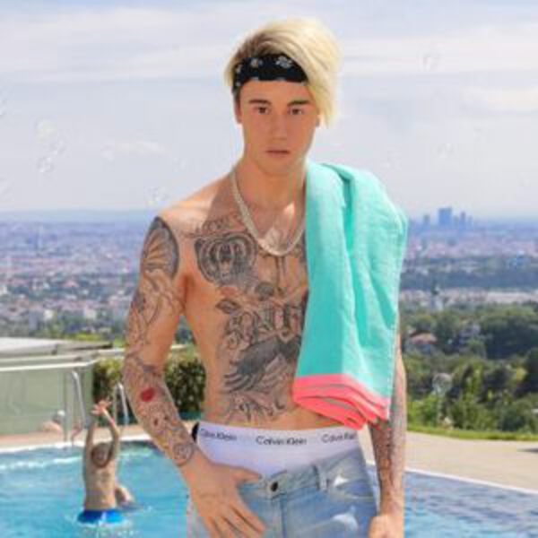 Наряд канадца ограничен рваными джинсами и белым нижним бельем Calvin Klein. Остальное - чистая (восковая) кожа. В таком виде настоящего Джастина Бибера часто видят на публике. Особой изюминкой являются также его 39 татуировок, нанесение которых на фигуру заняло у английских студий несколько недель.