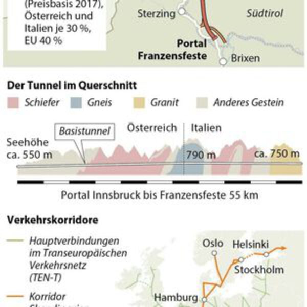 Гигантский проект Brennerbasistunnel с 64 километрами подземных туннелей настойчиво продвигается. Более 100 из 230 километров уже пробиты. Точные работы огромного масштаба предъявляют большие требования ко всем участникам процесса. Шоссе особого типа: транспортное средство Brennerbasistunel Gesellschaft (BBT SE) пробивается вперед по уже разведанным туннельным километрам. На 15 километров впереди - «жемчужина» и большая гордость строительства - 200-метровая машина для бурения с открытым захватом (Tunnelbohrmaschine).