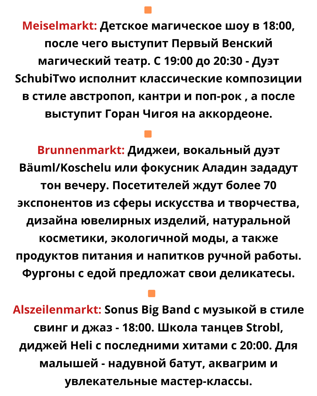 🔹Первые 10 000 посетителей получат бесплатные сумки с венских рынков. Кроме того, на всех рынках, начиная с 21:30, будут разыграны 220 подарочных корзин. Для участия необходимо посетить как минимум два рынка и иметь проштампованную карту участника.