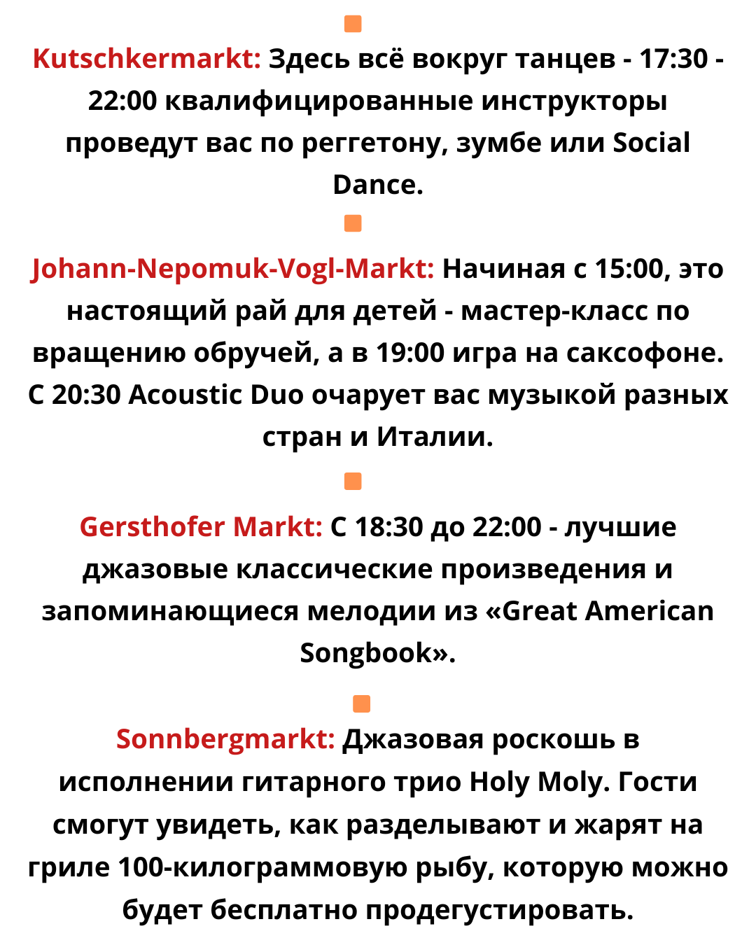 🔹Karmelitermarkt: выступление Swingdance Big Band начнётся с 17:00 до 18:00, а затем с 18:00 до 19:00 кукольный театр Tabula Rasa представит спектакль «Бременские музыканты». В 19:00 дунайские пираты приглашают вас петь, танцевать и мечтать вместе с ними. Программа завершится исполнением «Wienerlied einmal anders» в исполнении Fiaker Fiasko (с 20:00 до 22:00). Ассортимент рынка будет расширен за счёт ярмарки изделий декоративно-прикладного искусства и детского блошиного рынка.