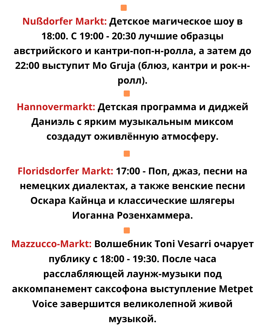 🔹Meidlinger Markt: программа начнётся в 16:30 - венгерский Gipsy Jazz, с 20:00 зазвучат итальянские мелодии под девизом «Amore Italiano». Алекс Микш исполнит свой блюз на вальдфиртельском диалекте в Fladenladen (с 20:00 до 21:30).