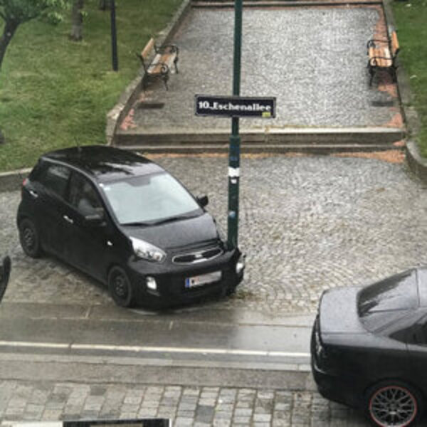 Авария произошла на Эшеналлее в Вене-Фаворитен в понедельник утром: водитель въехал в фонарь во время парковки, разбив при этом свою черную Kia.