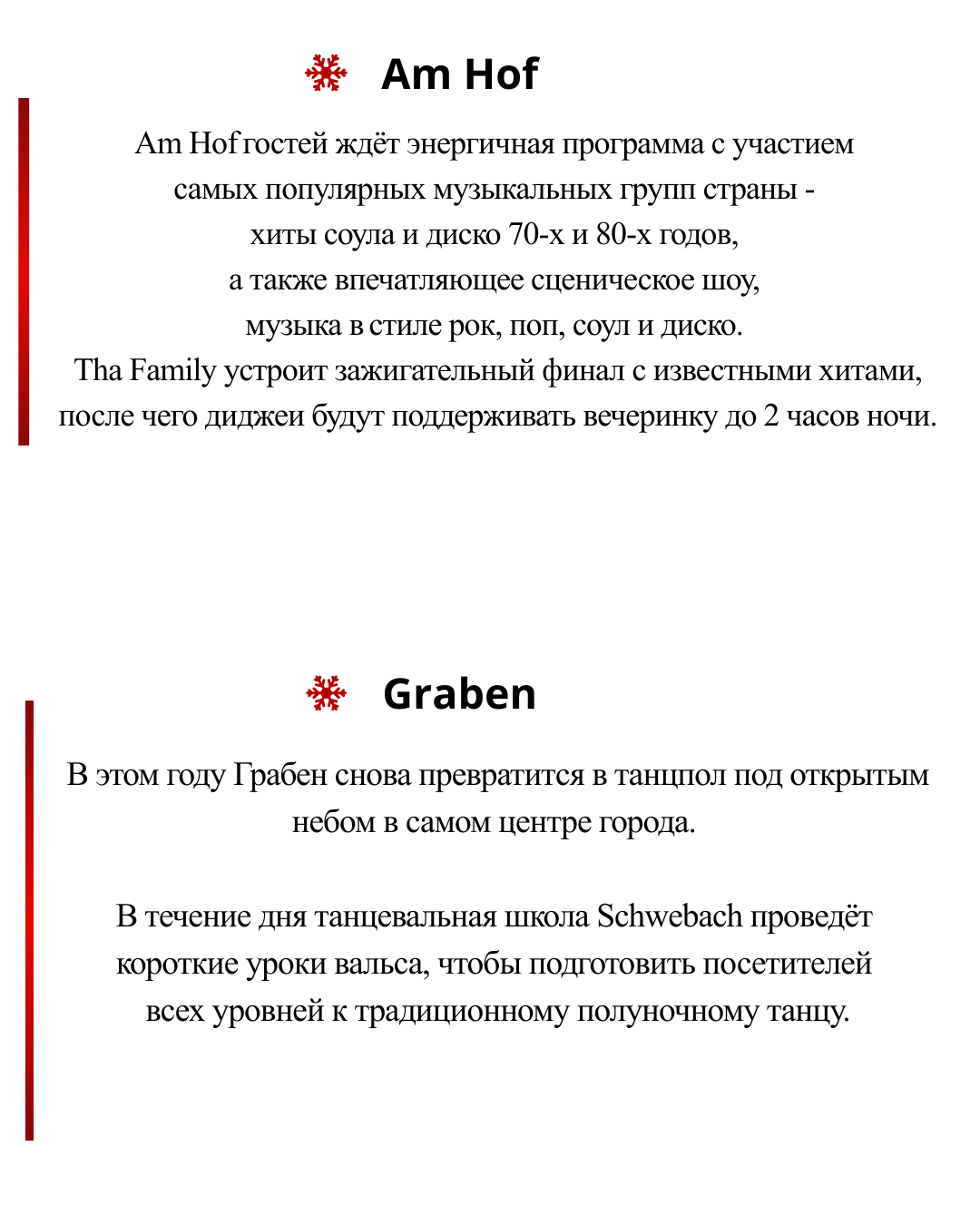 31 декабря центр Вены (Innenstadt) снова превратится в гигантскую сцену под открытым небом, которая предложит бесплатную живую музыку от вальса до хитов вечеринок, а также выступления и кулинарные изыски.