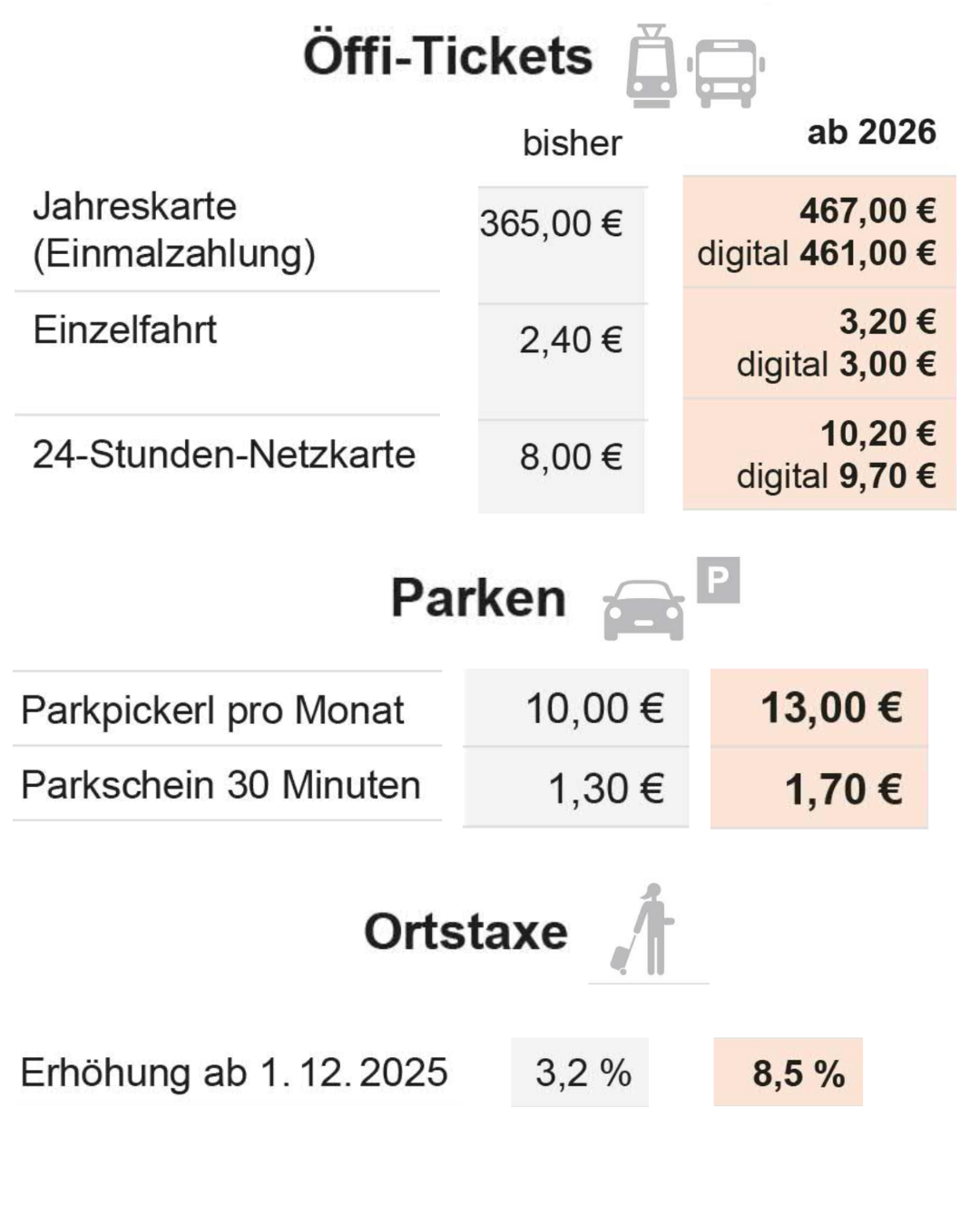 🔹 Также будет подорожание в сфере туризма. Местный налог будет увеличен с 3,2% до 8,5%. Повышение тарифов было представлено депутатами городского совета по финансам и по транспорту (оба – SPÖ). Они были обоснованы бюджетной ситуацией и возросшей потребностью в консолидации.