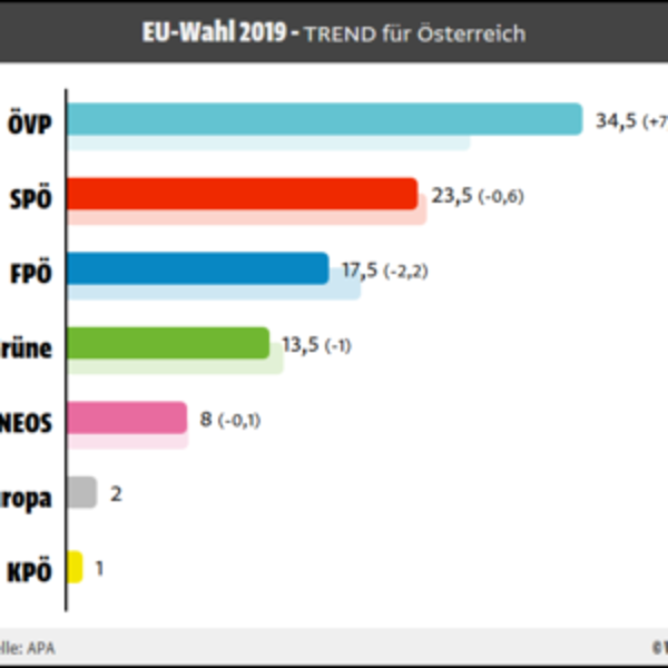 Согласно прогнозу ARGE Wahlen, APA, ORF и ATV, Народная партия набирает 34.5% голосов, СДПА – 23.5%, АПС – 17.5%. Зелёные и NEOS получают 13.5 и 8% соответственно, Liste JETZT далеко позади.